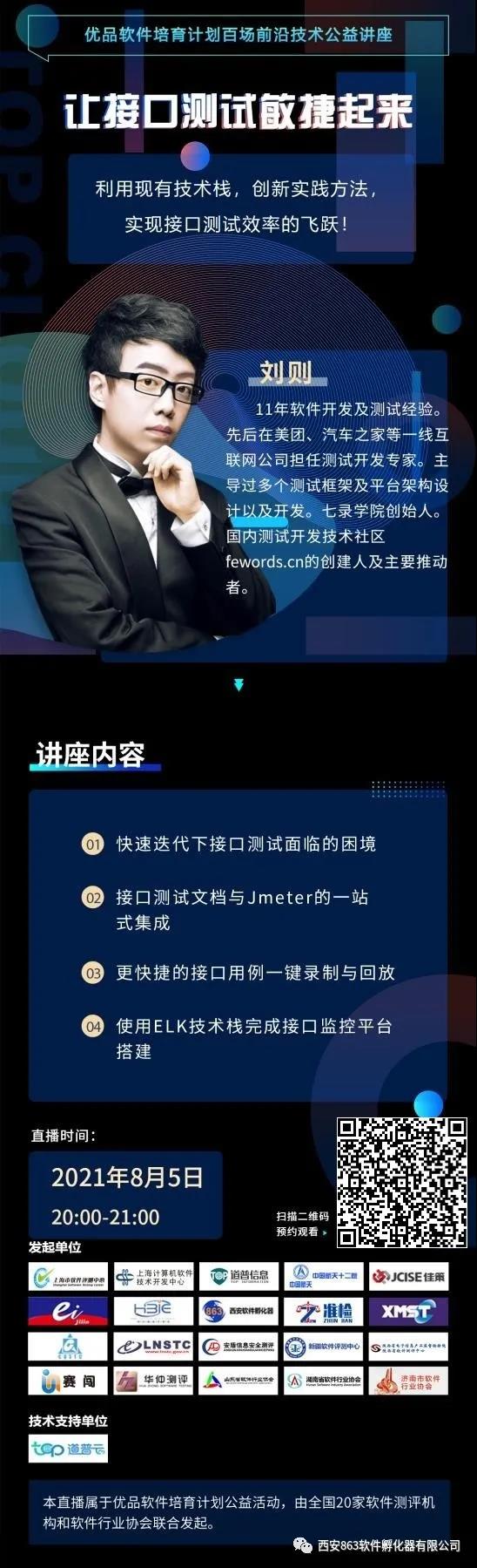 一、 直播時(shí)間: 2021年08月05日 20:00 二、 直播主題: 讓接口測試敏捷起來 三、 講座提綱: 1、 快速迭代下接口測試面臨的困境 2、 接口測試文檔與Jmeter的一站式集成 3、 更快捷的接口用例一鍵錄制與回放 4、 使用ELK技術(shù)棧完成接口監(jiān)控平臺(tái)搭建 四、 主講人介紹: 劉則,七錄學(xué)院創(chuàng)始人&CEO,11年軟件開發(fā)及測試經(jīng)驗(yàn),先后在美團(tuán)、汽車之家等一線互聯(lián)網(wǎng)公司擔(dān)任測試開發(fā)專家,主導(dǎo)過多個(gè)測試框架、測試平臺(tái)架構(gòu)設(shè)計(jì)以及開發(fā)。曾為大唐電信、中國移動(dòng)研究院等知名企業(yè)提供性能測試、自動(dòng)化測試等服務(wù)。五年授課經(jīng)驗(yàn),騰訊課堂累計(jì)聽課人數(shù)超過1萬。中國政法大學(xué)《大數(shù)據(jù)智能分析》專職講師。國內(nèi)測試開發(fā)技術(shù)社區(qū)fewords.cn的創(chuàng)建人及主要推動(dòng)者。 五、 直播流程 1. 優(yōu)品軟件培育計(jì)劃及本期合作機(jī)構(gòu)介紹 2. 主講人介紹 3. 主講人開始演講 4. 現(xiàn)場答疑互動(dòng) 5. 下期直播預(yù)告 六、 觀看方式: 掃描宣傳頁中的二維碼→進(jìn)入社群→群內(nèi)點(diǎn)擊直播鏈接→觀看